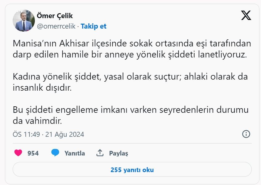 AK Parti Sözcüsü ve Genel Başkan Yardımcısı Ömer Çelik, sosyal medya hesabından yaptığı açıklamada, kadına yönelik şiddetin yasal olarak suç olduğunu, ahlaki olarak da insanlık dışı olduğunu belirtti.