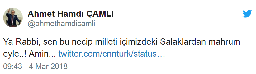 Ahmet Hamdi Çamlı da sosyal medya hesabından Celal Şengör'e karşılık vererek, “Ya Rabbi, sen bu necip milleti içimizdeki Salaklardan mahrum eyle..! Amin...” dedi.