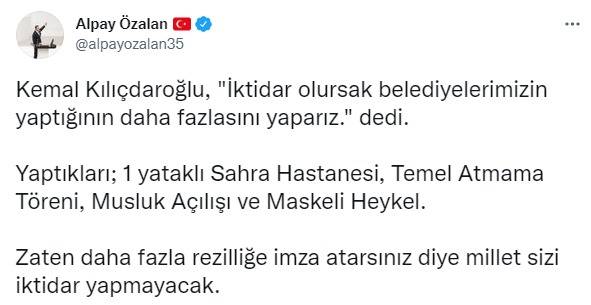 TBMM İdari Amiri ve AK Parti İzmir Milletvekili Alpay Özalan, sosyal medya hesabından yaptığı paylaşımda, CHP Lideri Kemal Kılıçdaroğlu’nun "İktidar olursak belediyelerimizin yaptığının daha fazlasını yaparız” sözünü hatırlatarak, son zamanlarda CHP’nin yaptıklarını sıralayarak, “Zaten daha fazla rezilliğe imza atarsınız diye millet sizi iktidar yapmayacak” dedi.