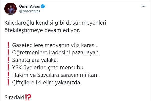 Twitter hesabından bir video yayımlayan AK Parti Sosyal Medya Koordinatörü Ömer Arvas, CHP Genel Başkanı Kemal Kılıçdaroğlu'nun son dönemde yaptığı ötekileştirme konuşmalarını derleyerek şu soruyu sordu: "Sıradaki kim olacak?"