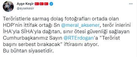 Resmi sosyal medya hesabından paylaşımda bulunan Düzce Milletvekili Ayşe Keşir, “Teröristlerle sarmaş dolaş fotoğrafları ortada olan HDP'nin ittifak ortağı Sn@meral_aksener, terör inlerini İHA'yla SİHA'yla dağıtan, sınır ötesi güvenliği sağlayan Cumhurbaşkanımız Sayın @RTErdogan'a "Terörist başını serbest bırakacak" iftirasını atıyor. Bu bühtan siyasetidir” ifadelerine yer verdi.