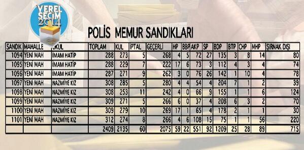 Şırnak’ta; polis ve memur lojmanlarında kalan memurlar, Yeni Mahalle İmam Hatip Lisesi ile Nazmiye Demirel Kız Meslek Lisesi’nde oy kullandı. Memur ve polislerin oy kullandığı 1094., 1095., 1096., 1097., 1098., 1099., 1100. ve 1101. nolu sandıklardan BDP’ye bin 209 oy, AK Parti’ye 551 oy çıktı.