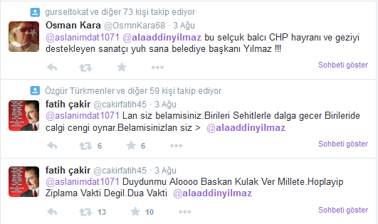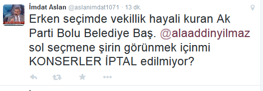 Bolu Köroğlu Gazeteciler Cemiyeti Başkanı "Erken seçimde vekillik hayali kuran Ak Parti Bolu Belediye Başkanı Alaaddin Yılmaz sol seçmene şirin görünmek için mi konserler iptal edilmiyor?" şeklinde bir soru sorarak büyük tepki gösterdi.