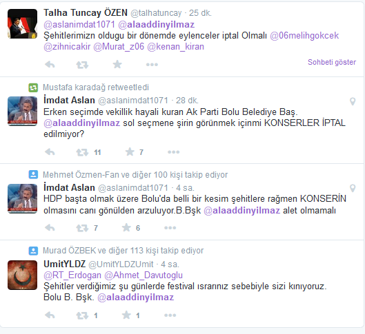 Geçtiğimiz günlerde, AK Parti Genel Merkezi, AK Partili belediye başkanlarına bir yazı göndererek eğlence, festival ve konser etkinliklerinin iptal edilmesini istemişti. Genel Başkan Yardımcısı ve Yerel Yönetimler Başkanı Gaziantep Milletvekili Abdülhamit Gül imzası ile gönderilen yazıda, Şanlıurfa'nın Suruç ilçesinde meydana gelen ve tüm Türkiye'yi yasa boğan terör saldırısı nedeniyle, belediyelerin müzikli etkinlikleri, konser, eğlence ve şölenleri iptal edilmesi konusunda gerekli hassasiyeti göstermeleri istendi. AK Parti Antalya İl Başkanı Rıza Sümer de "Suruç'ta meydana gelen terör saldırısı millet olarak hepimizi yasa boğdu. Adıyaman ve Diyarbakır'da asker ve polislerimize yönelik teröristler tarafından yapılan saldırıyı da lanetliyoruz. Belediye başkanlarımızın bu süreçte hassas davranmalarını ve düzenleyecekleri eğlence, konser ve şenlikleri iptal etmelerini istiyoruz" diye konuştu. Buna rağmen Bolu Belediyesi Başkanı Alaaddin Yılmaz, talimatı dinlemeyip konseri hala iptal etmedi.