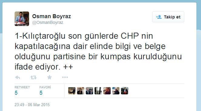 YENİAKİT.COM.TR - "Kılıçdaroğlu son günlerde CHP'nin kapatılacağına dair elinde bilgi ve belge olduğunu, partisine bir kumpas kurulduğunu ifade ediyor” şeklinde attığı ilk tweetin ardından yeni Türkiye’de kolay kolay parti kapatılmayacağını ifade eden Boyraz, "2015 Türkiye'sinde artık parti kapatma Türkiye'nin gündeminden çıkmıştır. Kimse mızıkçılık yapmaya kalkmasın. Partileri millet kapatır" dedi.