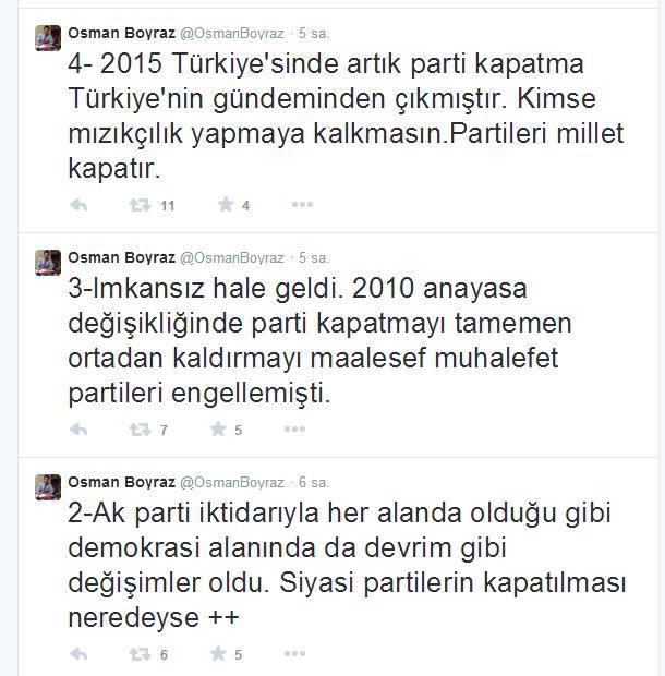 4- 2015 Türkiye'sinde artık parti kapatma Türkiye'nin gündeminden çıkmıştır. Kimse mızıkçılık yapmaya kalkmasın.Partileri millet kapatır.