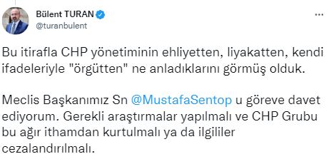 AK Parti Grup Başkanvekili, Çanakkale Milletvekili Bülent Turan, resmi sosyal medya hesabından, TBMM Başkanı Mustafa Şentop’u göreve davet ederek, “Meclis Başkanımız Sn @MustafaSentop’u göreve davet ediyorum. Gerekli araştırmalar yapılmalı ve CHP Grubu bu ağır ithamdan kurtulmalı ya da ilgililer cezalandırılmalı” ifadelerini kullandı.