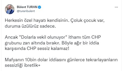 AK Parti Grup Başkanvekili, Çanakkale Milletvekili Bülent Turan, “Herkesin özel hayatı kendisinin. Çoluk çocuk var, duruma üzülürüz sadece. Ancak ‘Dolarla vekil olunuyor’ ithamı tüm CHP grubunu zan altında bırakır. Böyle ağır bir iddia karşısında CHP sessiz kalamaz! Mafyanın 10bin dolar iddiasını günlerce tekrarlayanların sessizliği ibretlik. Bu itirafla CHP yönetiminin ehliyetten, liyakatten, kendi ifadeleriyle ‘örgütten’ ne anladıklarını görmüş olduk. “Meclis Başkanımız Sn @MustafaSentop’u göreve davet ediyorum. Gerekli araştırmalar yapılmalı ve CHP Grubu bu ağır ithamdan kurtulmalı ya da ilgililer cezalandırılmalı” ifadelerini kullandı.