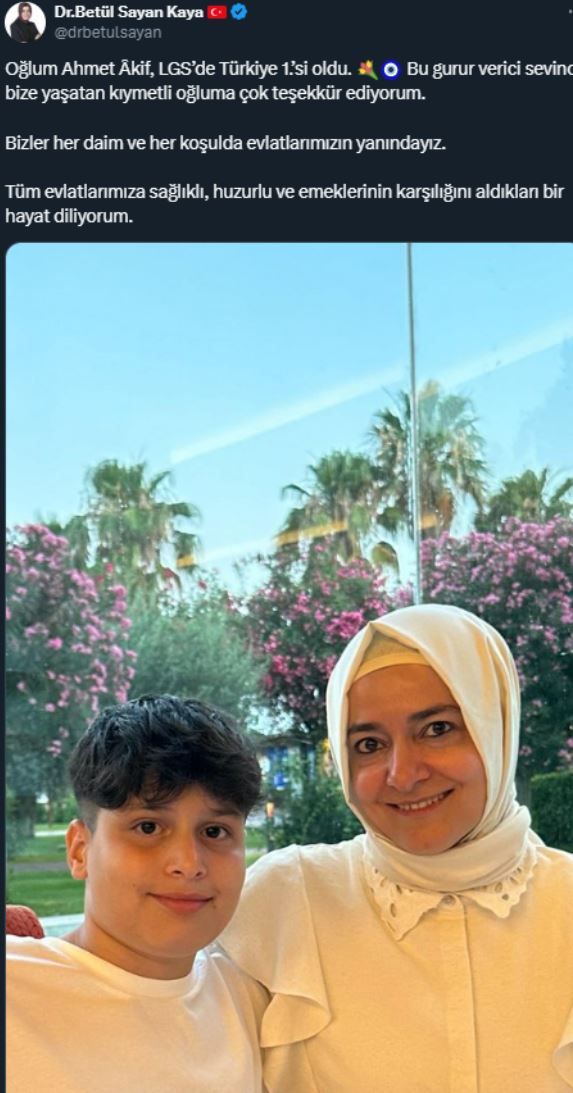 Ak Parti Genel Başkan Yardımcısı Betül Sayan Kaya, X'teki sosyal medya hesabından oğlunun Lgs'de derece yaptığını duyurdu.