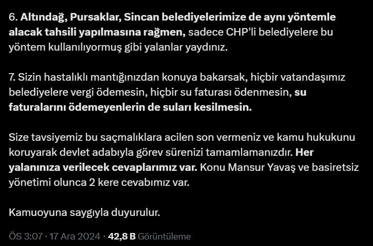6. Altındağ, Pursaklar, Sincan belediyelerimize de aynı yöntemle alacak tahsili yapılmasına rağmen, sadece CHP'li belediyelere bu yöntem kullanılıyormuş gibi yalanlar yaydınız.