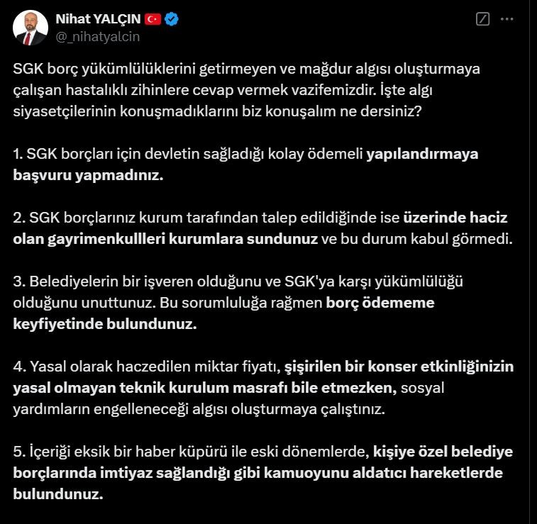 Nihat Yalçın, sosyal medya hesabından yaptığı paylaşımda, “Size tavsiyemiz bu saçmalıklara acilen son vermeniz ve kamu hukukunu koruyarak devlet adabıyla görev sürenizi tamamlamanızdır. Her yalanınıza verilecek cevaplarımız var. Konu Mansur Yavaş ve basiretsiz yönetimi olunca 2 kere cevabımız var” ifadelerine yer verdi.