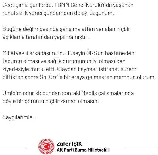 Basında kendisi adına yapılan açıklamaların hiçbirisinin kendine ait olmadığını söyleyen Işık, "Milletvekili arkadaşım Sn. Hüseyin ÖRS'ün hastaneden taburcu olması ve sağlık durumunun iyi olması beni ziyadesiyle mutlu etti." dedi.