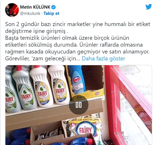 Metin paylaşımında şu ifadeleri kullandı: "Son 2 gündür bazı zincir marketler yine hummalı bir etiket değiştirme işine girişmiş . Başta temizlik ürünleri olmak üzere birçok ürünün etiketleri sökülmüş durumda. Ürünler raflarda olmasına rağmen kasada okuyucudan geçmiyor ve satın alınamıyor. Görevliler, 'zam geleceği için ürünler satışa kapalı' diyerek müşteriye ürün satışı yapmıyorlar."