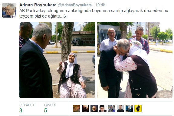 Adıyaman'da seçim çalışmalarını sürdüren AK Parti milletvekili adayı Adnan Boynukara köy ziyareti sırasında AK Partili olduğunu öğrenen bir teyzenin kendisine sarılıp ağladığını açıkladı.