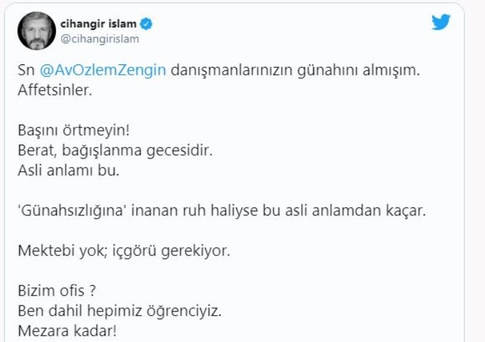 Cihangir İslam ise, hatasını kabul etmek yerine hala ilk ısrar etti. İslam, "Başını örtmeyin! Berat, bağışlanma gecesidir. Asli anlamı bu" ifadelerini kullandı.