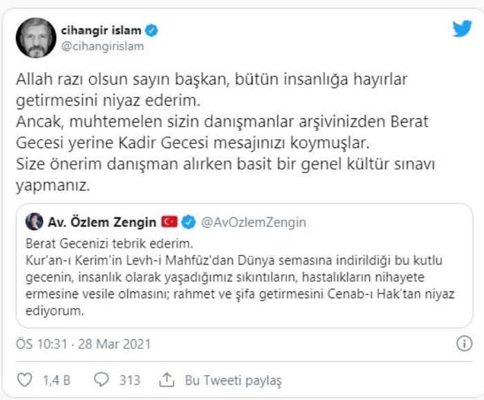 AK Parti Genel Başkan Yardımcısı Özlem Zengin, Berat Gecesi'ni kutlamak için sosyal medya hesabından paylaşım yaptı. CHP İstanbul Milletvekili Cihangir İslam, Zengin'in paylaşımını eleştirmeye çalışarak, "Sizin danışmanlar arşivinizden Berat Gecesi yerine Kadir Gecesi mesajınızı koymuşlar. Size önerim danışman alırken basit bir genel kültür sınavı yapmanız" dedi.