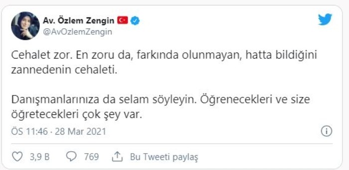 "Cehalet zor. En zoru da, farkında olunmayan, hatta bildiğini zannedenin cehaleti. Danışmanlarınıza da selam söyleyin. Öğrenecekleri ve size öğretecekleri çok şey var."