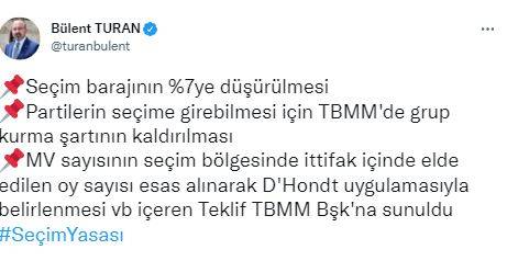 Resmi sosyal medya hesabından paylaşımda bulunan AK Parti Grup Başkanvekili, Çanakkale Milletvekili Bülent Turan, “Seçim barajının yüzde 7’ye düşürülmesi, Partilerin seçime girebilmesi için TBMM'de grup kurma şartının kaldırılması, Milletvekili sayısının seçim bölgesinde ittifak içinde elde edilen oy sayısı esas alınarak D'Hondt uygulamasıyla belirlenmesi vb içeren Teklif TBMM Bşk'na sunuldu” ifadelerine yer verdi.