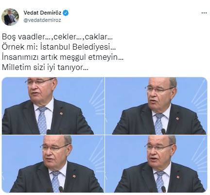 “Boş vaadler.. …,cekler…,caklar… Örnek mi: İstanbul Belediyesi… İnsanımızı artık meşgul etmeyin… Milletim sizi iyi tanıyor…”