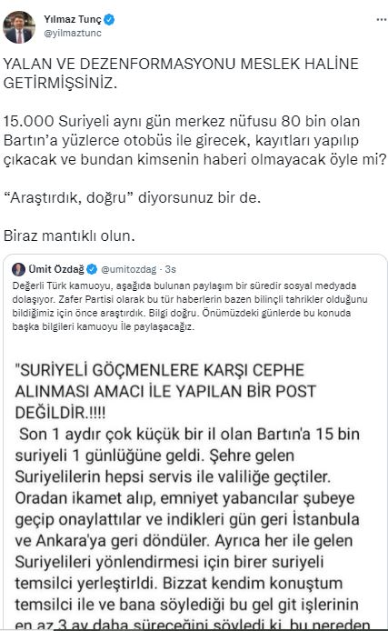 Zafer Partisi Genel Başkanı Ümit Özdağ’ın resmi sosyal medya hesabından yaptığı paylaşıma ilişkin cevap veren AK Parti Bartın Milletvekili Yılmaz Tunç, “YALAN VE DEZENFORMASYONU MESLEK HALİNE GETİRMİŞSİNİZ. 15.000 Suriyeli aynı gün merkez nüfusu 80 bin olan Bartın’a yüzlerce otobüs ile girecek, kayıtları yapılıp çıkacak ve bundan kimsenin haberi olmayacak öyle mi? ‘Araştırdık, doğru’ diyorsunuz bir de. Biraz mantıklı olun” ifadelerini kullandı.