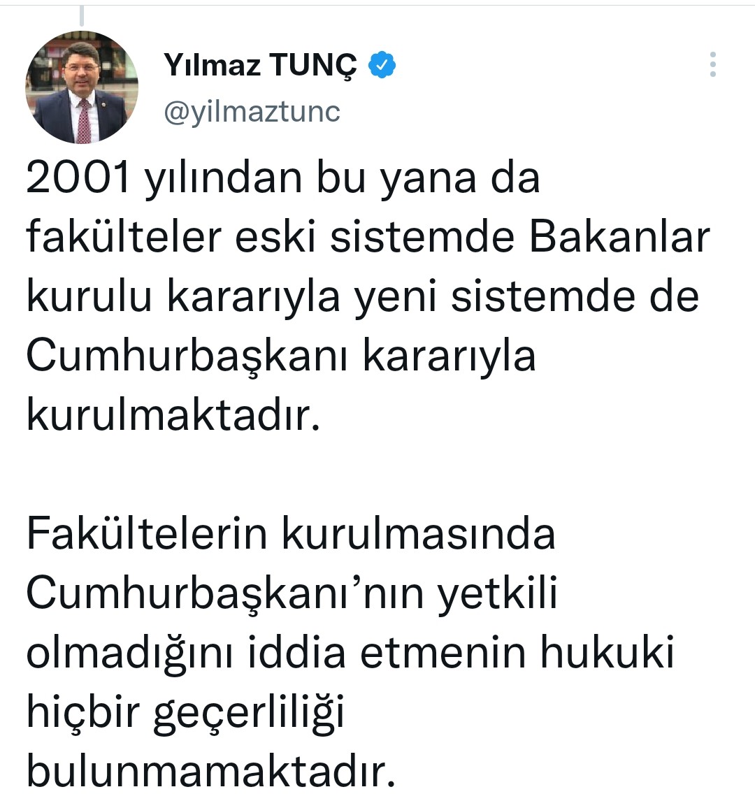 AK Parti Grup Başkanvekili ve Bartın Milletvekili Yılmaz Tunç, "2001 yılından bu yana da fakülteler eski sistemde Bakanlar kurulu kararıyla yeni sistemde de Cumhurbaşkanı kararıyla kurulmaktadır. Fakültelerin kurulmasında Cumhurbaşkanı’nın yetkili olmadığını iddia etmenin hukuki hiçbir geçerliliği bulunmamaktadır" dedi.