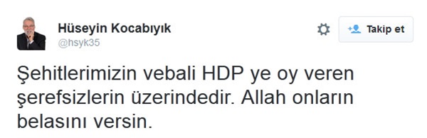AK Parti İzmir milletvekili Hüseyin Kocabıyık, "Şehitlerimizin vebali HDP'ye oy veren şerefsizlerin üzerindedir. Allah onların belasını versin" dedi.