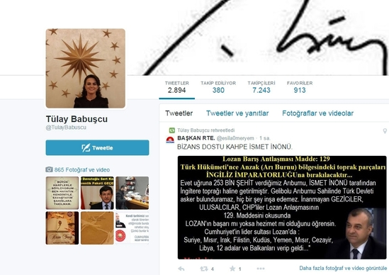 AK Parti Balıkesir Milletvekili Tülay Babuşçu, “BAŞKAN RTE” adlı Twitter kullanıcısının “Bizans dostu kahpe İsmet İnönü” başlıklı tweetini paylaştı. Ak Parti'den tekrar aday adayı olan Babuşçu’nun paylaştığı tweette, Dr. Mehmet Hakan Sağlam’ın yazdığı öne sürülen şu mesaj yer aldı: