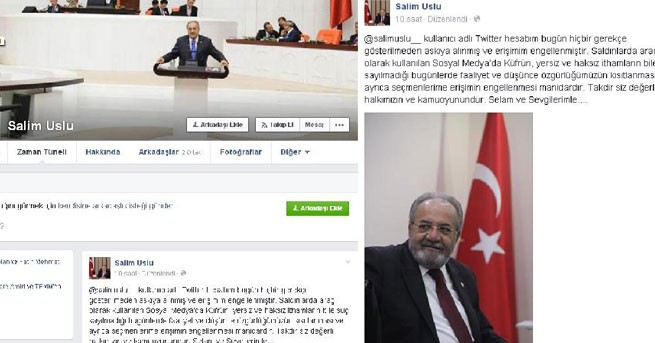 Çorum Milletvekili Salim Uslu, kendisine ait Twitter hesabının hiçbir gerekçe gösterilmeden askıya alınıp erişiminin engellendiğini duyurdu.