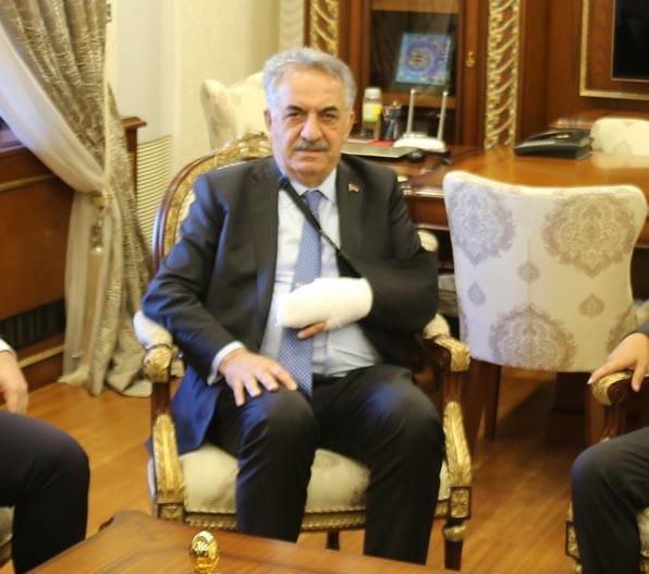 Hayati Yazıcı, aniden önüne çıkan otomobile çarpmamak için şoförünün sert fren yaptığı makam aracında, elinden yaralandı.