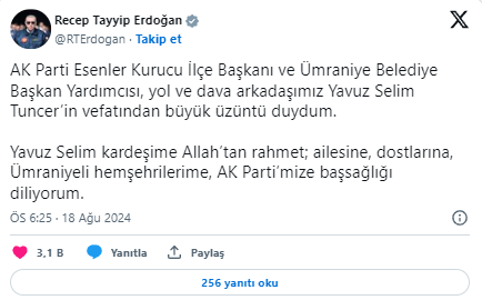 X hesabından paylaşımda bulunan Erdoğan, Tuncer'in vefatı nedeniyle büyük üzüntü duyduğunu belirterek, "Yavuz Selim kardeşime Allah’tan rahmet; ailesine, dostlarına, Ümraniyeli hemşehrilerime, AK Parti’mize başsağlığı diliyorum." dedi.