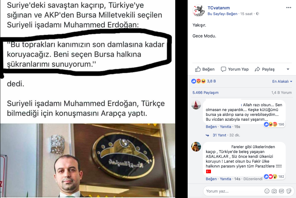 Sosyal medyada yer alan ve AK Parti’den Bursa milletvekili adayı olan Suriye kökenli Muhammed Erdoğan’ın seçildikten sonra yaptığı konuşmada, “bu toprakları kanımızın son damlasına kadar koruyacağız. Beni seçen Bursa halkına şükranlarımı sunuyorum” dediği ve bu konuşmasını Türkçe bilmediği için Arapça yaptığı iddia edildi.