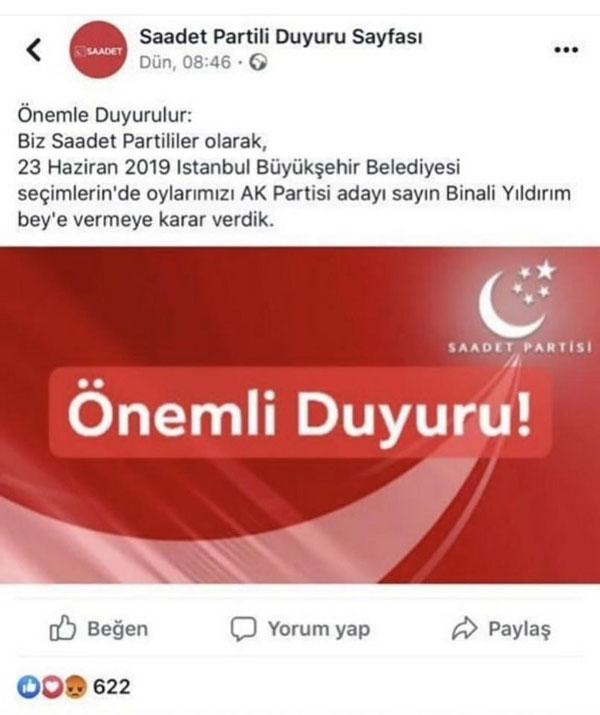 “Saadet Partili Duyuru Sayfası” isimli sosyal medya hesabı, 23 Haziran seçimlerinde AK Parti’nin adayı Binali Yıldırım’ı destekleyeceklerini ilan etti. Grup kararını, “Biz Saadet Partililer olarak, 23 Haziran 2019 İstanbul büyükşehir belediyesi seçimlerinde oylarımızı AK Parti adayı Binali Yıldırım’a vermeye karar verdik.” ifadeleriyle duyurdu.