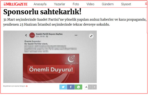 23 Haziran İstanbul seçiminden önce bir kısım Milli Görüşçüler, oylarını AK Parti’nin adayı Binali Yıldırım’a vereceklerini sosyal medya üzerinden ilan etti. Saadet Partisi’nin gazetesi Milli Gazete, bu duruma sert tepki gösterdi.