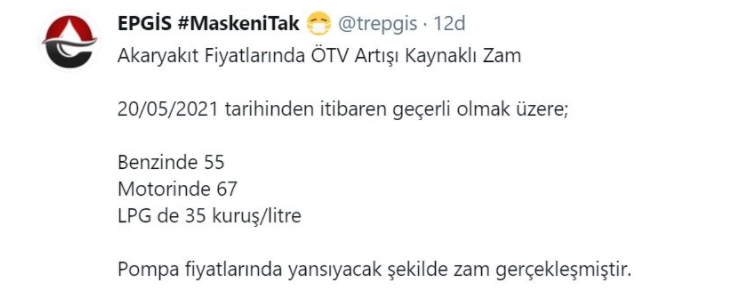 Enerji Petrol Gaz İkmal İstasyonları İşveren Sendikası (EPGİS) tarafından yapılan açıklamada vergi düzenlemesi sonrasında bugünden itibaren geçerli olmak üzere benzinin litre fiyatının 55 kuruş, motorinin 67 kuruş, LPG'nin ise 35 kuruş zamlandığını duyurdu.