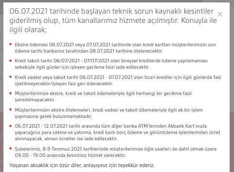 Akbank, 6-7 Temmuz'da gerçekleşmesi gereken kredi kartı ve kredi ödemelerinin bugüne ertelendiğini, gecikme faizlerinin de iade edileceğini duyurdu. Banka, 12 Temmuz'a kadar diğer ATM'lerden yapılan işlemlerden alınan ücretlerin de geri yatırılacağını bildirdi.