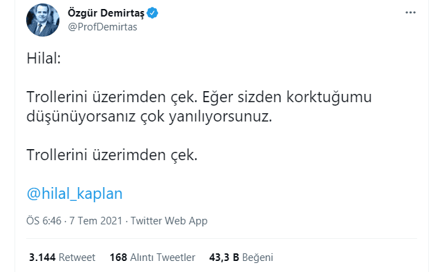 Hazırladığı videolarla AK Parti iktidarını hedef alan Özgür Demirtaş'ın Akbank Yönetim Kurulu'nda olduğu çıktı. Vatandaşlar, Demirtaş'ın Akbank konusundaki sessizliğine tepki gösterdi. Gelen tepkilere verecek cevap bulamayan Özgür Demirtaş çareyi 'trol' suçlamasında bularak, 'Hilal Kaplan, trollerini üzerimden çek." dedi.