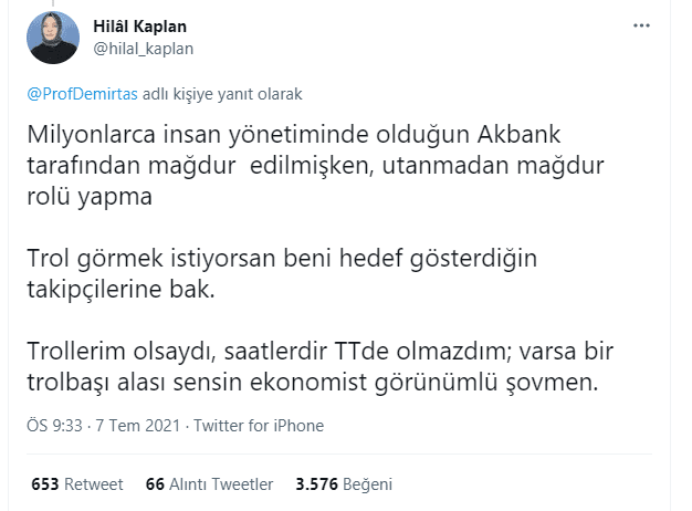 Kaplan, Demirtaş'ın tweet mesajına sert tepki gösterdi: "Milyonlarca insan yönetiminde olduğun Akbank tarafından mağdur edilmişken, utanmadan mağdur rolü yapma. Trol görmek istiyorsan beni hedef gösterdiğin takipçilerine bak. Trollerim olsaydı, saatlerdir TTde olmazdım; varsa bir trolbaşı alası sensin ekonomist görünümlü şovmen."