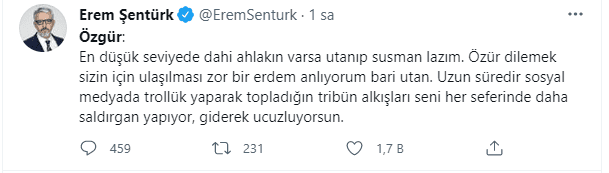 Gazeteci Erem Şentürk de Demirtaş'a tepki göstererek şu ifadeleri kullandı: "En düşük seviyede dahi ahlakın varsa utanıp susman lazım. Özür dilemek sizin için ulaşılması zor bir erdem anlıyorum bari utan. Uzun süredir sosyal medyada trollük yaparak topladığın tribün alkışları seni her seferinde daha saldırgan yapıyor, giderek ucuzluyorsun."