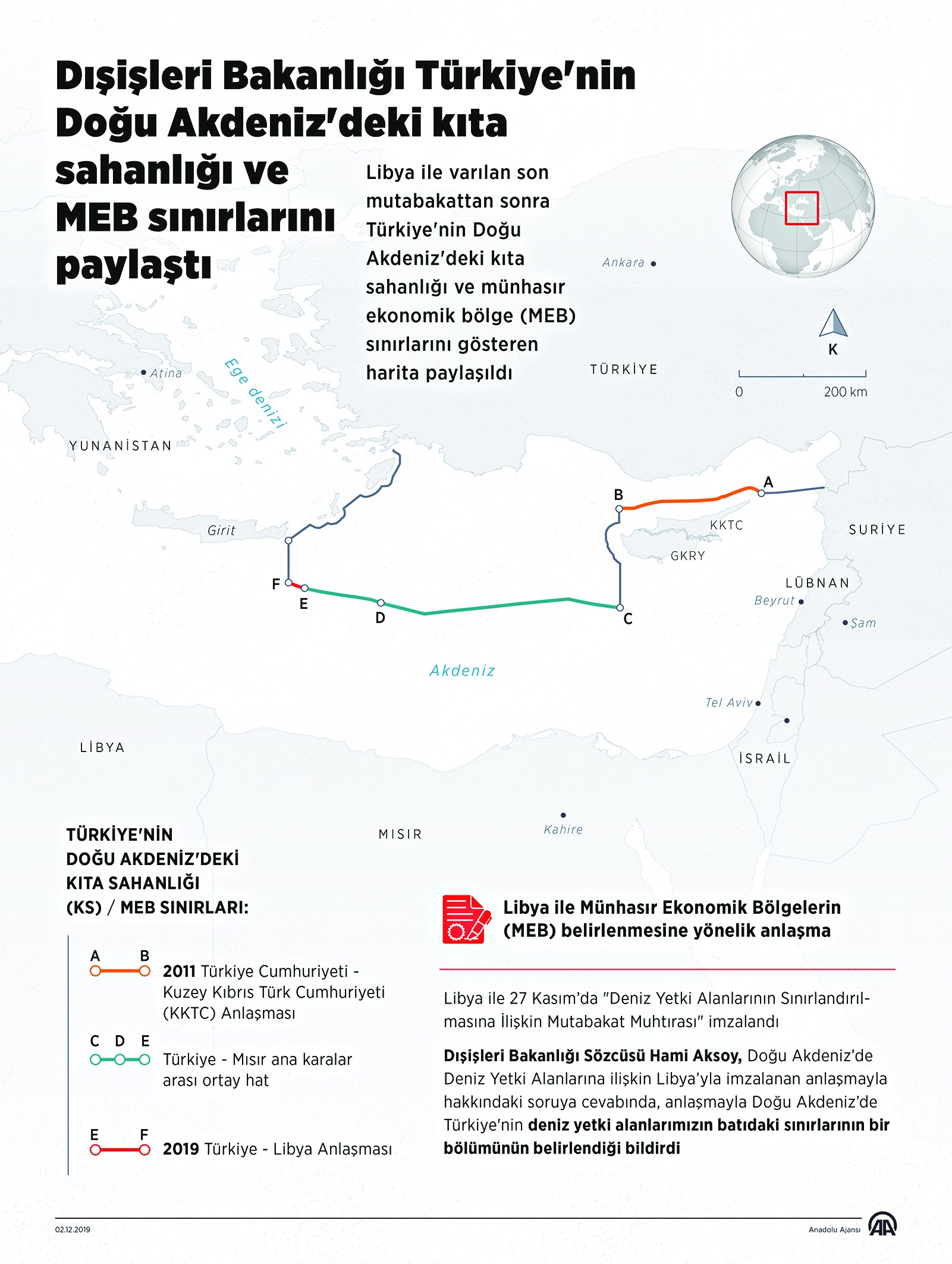 Türkiye ile Kuzey Kıbrıs Türk Cumhuriyeti arasında 2011’deki anlaşmada belirlenen hat A ve B noktaları gösterilen haritada, Türkiye ve Mısır arasındaki “ana karalar arası ortay hat” C, D ve E noktalarıyla işaretlendi. Türkiye ile Libya’nın geçen hafta imzaladığı “Deniz Yetki Alanlarının Sınırlandırılmasına İlişkin Mutabakat Muhtırası” ile belirlenen noktalar ise E ve F şeklinde gösterildi.