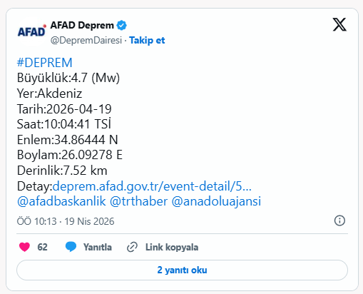 AFAD verilerine göre Akdeniz'de 4,7 büyüklüğünde deprem meydana geldi.