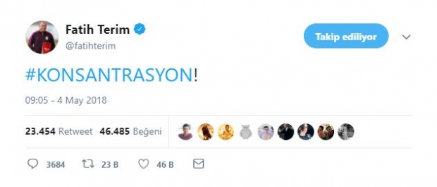 Spor Toto Süper Lig'de bitime 3 hafta kala 66 puanla lider durumda bulunan Galatasaray'da teknik direktör Fatih Terim, Teleset Mobilya Akhisarspor maçı öncesi "Konsantrasyon" şeklinde tweet atarak sarı kırmızılı camiaya mesaj verdi.