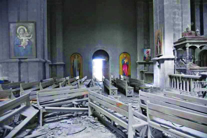Dağlık Karabağ’ın başkenti olarak lanse edilen Şuşi kentindeki “Tarihi Surp Ghazanchetsots Ermeni kilisesi Azerbaycan’a ait savaş uçağınca vuruldu. Azeri bombaları nedeniyle kilise hasar gördü ve kubbesi de kısmen yıkıldı” şeklinde yalan açıklama yapan Ermenistan hükümeti, fotoğrafları da sosyal medyadan yayımladı.