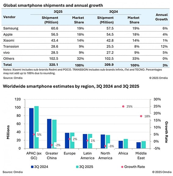 2025’in üçüncü çeyreğinde akıllı telefon pazarı yıllık %2 büyüme ile toparlanırken, Samsung liderliğini sürdürdü, Çinli markalar ise hızla yükseldi.