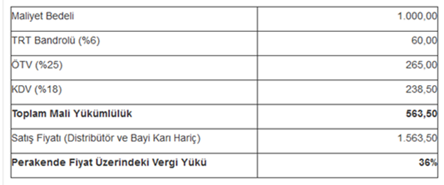 Özetle; 1000TL’lik bir telefon için Türkiye’de toplam 563,5 TL’si vergi ve mali yükümlülük olmak üzere 1563,5 TL ödeniyor. Yani, satın alınan akıllı telefonun perakende satış fiyatının yüzde 36’sı vergi ve mali yükümlülüklerden oluşuyor.