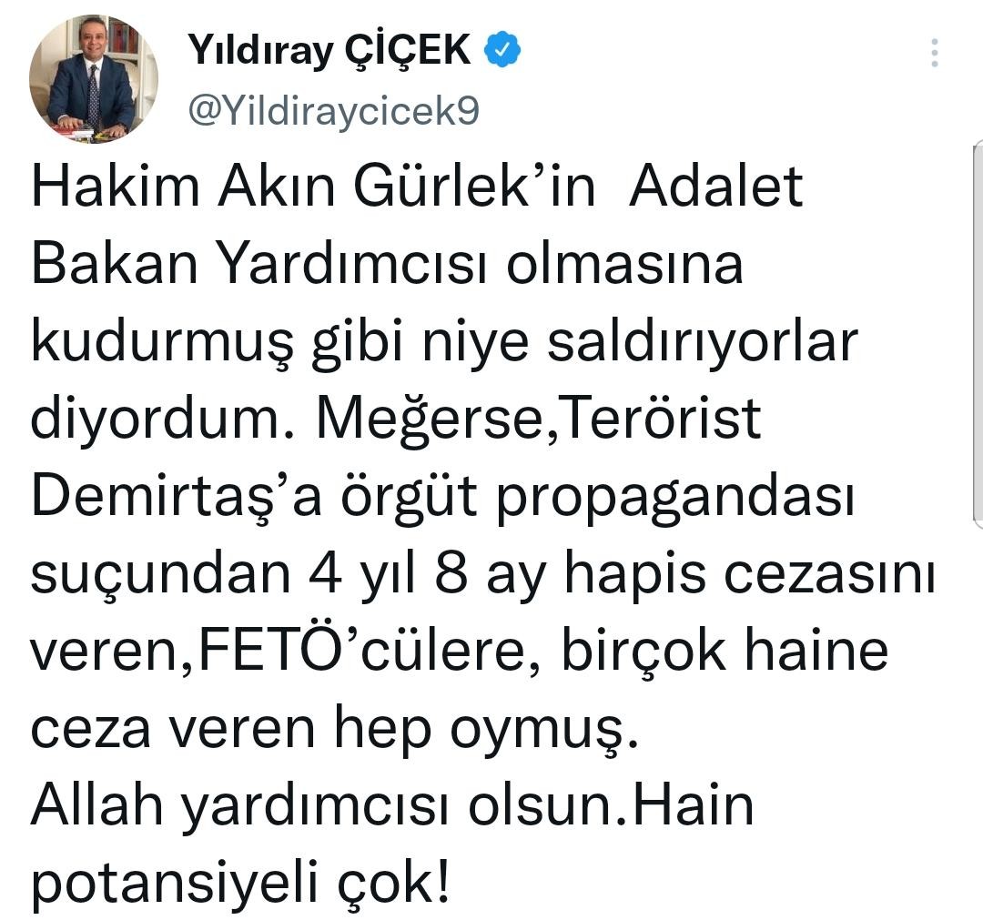 "Hakim Akın Gürlek’in Adalet Bakan Yardımcısı olmasına kudurmuş gibi niye saldırıyorlar diyordum. Meğerse, Terörist Demirtaş’a örgüt propagandası suçundan 4 yıl 8 ay hapis cezasını veren, FETÖ’cülere, birçok haine ceza veren hep oymuş. Allah yardımcısı olsun. Hain potansiyeli çok!"