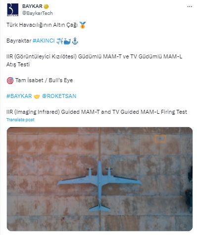 Bayraktar AKINCI TİHA, IIR (Görüntüleyici Kızılötesi) Güdümlü MAM-T ve TV Güdümlü MAM-L atış testini başarıyla tamamladı.