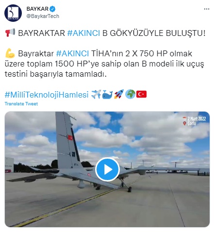 "Bayraktar AKINCI TİHA"nın 2 X 750 HP olmak üzere toplam 1500 HP güce sahip olan B modeli ilk uçuş testini başarıyla tamamladı.