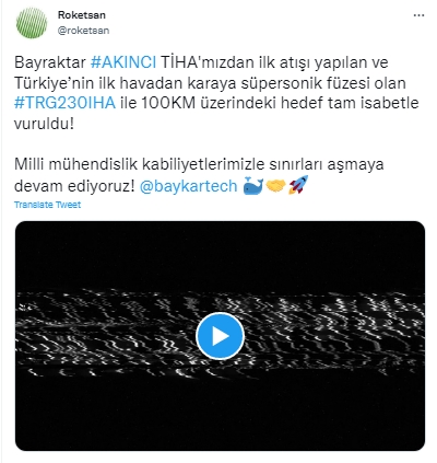 Bayraktar'ın Akıncı TİHA'sından ilk atışı yapılan ve Türkiye'nin ilk havadan karaya süpersonik füzesi olan #TRG230IHA ile 100 kilometre üzerindeki hedefin tam isabetle vurulduğu bildirilen paylaşımda, "Milli mühendislik kabiliyetlerimizle sınırları aşmaya devam ediyoruz" ifadesi kullanıldı.