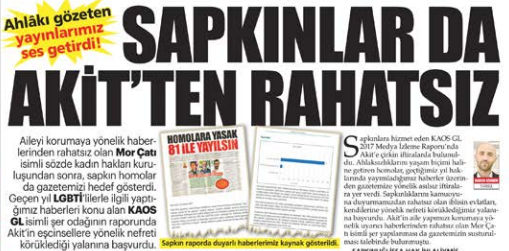 Akit, LGBTİ adlı sapkın oluşumlara karşı amansız mücadele veriyor. Gazetemizde yayınlanan eşcinsel sapkınlarla ilgili haberleri derleyen Kaos GL adlı oluşumun gazetemizi hedef gösterdiğine ilişkin yayınladığımız “Sapkınlar da Akit’ten rahatsız” haberi de büyük yankı buldu. Lut kavmini hatırlatan sapkınlara karşı yayınladığı haberlerle toplumun ifsad edilmesinin önüne geçen Akit’e karşı dört koldan saldırıya geçildi.