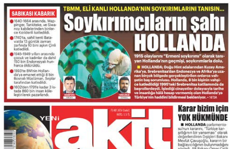 Akit, sözde Ermeni soykırımını parlamentoda onaylayarak tarihi bir skandala imza atan Hollanda’nın katliam şeceresini ortaya döktü. “Soykırımcıların şahı Hollanda” haberinde Akit, işlediği cinayetler dolayısıyla tarihe ve insanlığa hesap vermemiş olan Hollanda’nın katliamlarını bir bir yazdı.